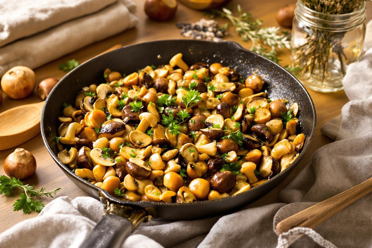 Un parfum boisé, une texture fondante et un goût qui colle aux souvenirs : cette poêlée de champignons et châtaignes fait partie de ces plats qu’on ne peut plus oublier. Facile à préparer, parfaite pour réchauffer l’automne ou illuminer un dîner d’hiver, elle surprend par sa richesse alors qu’elle ne demande presque rien. Mais attention, une fois que vous y goûtez… c’est difficile de s’arrêter.