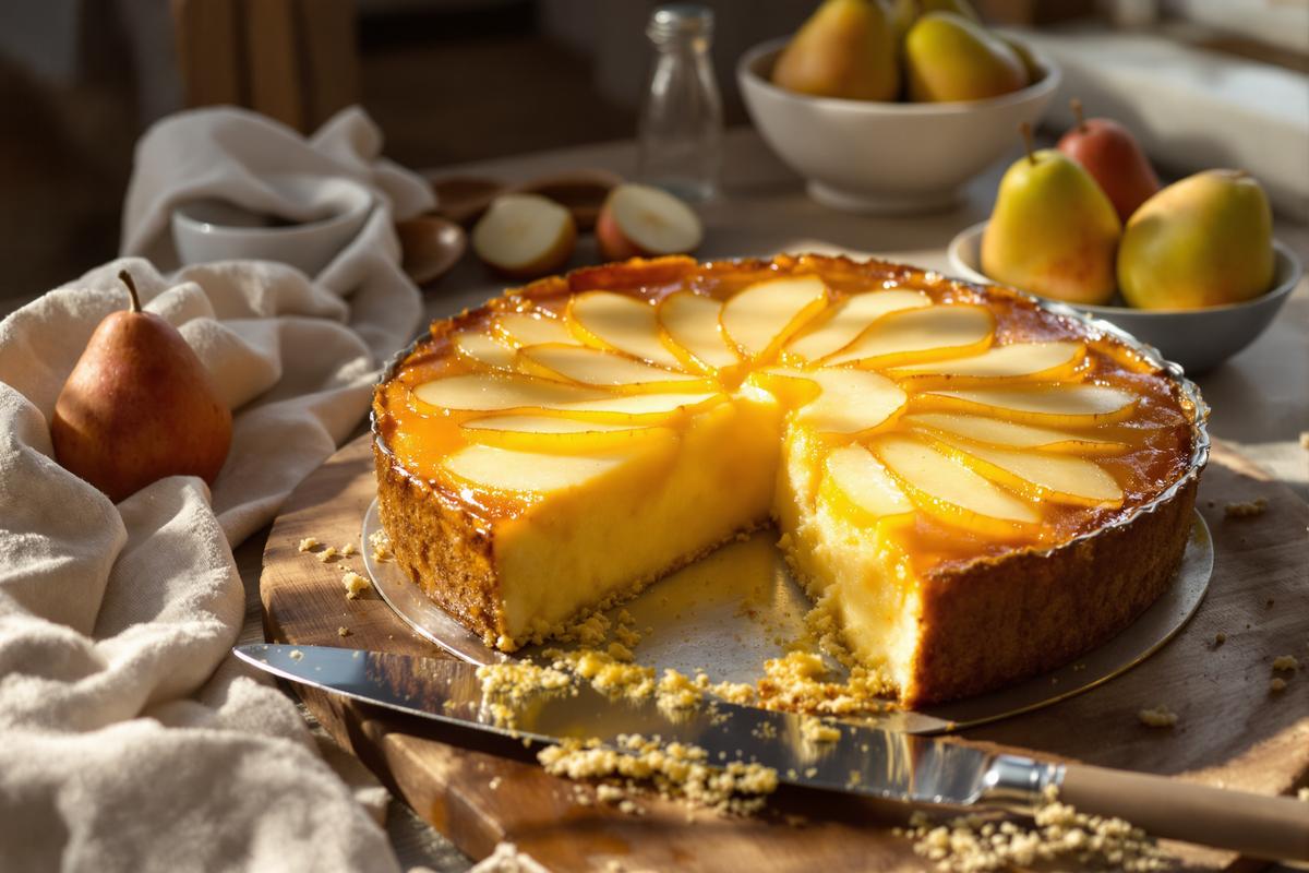 Là où ce gâteau fait la différence, c’est dans sa texture. Imaginez : une pâte bien légère, des lamelles de poires fondantes, et, au-dessus, un mélange de beurre fondu et de sucre qui devient croustillant à la cuisson.
