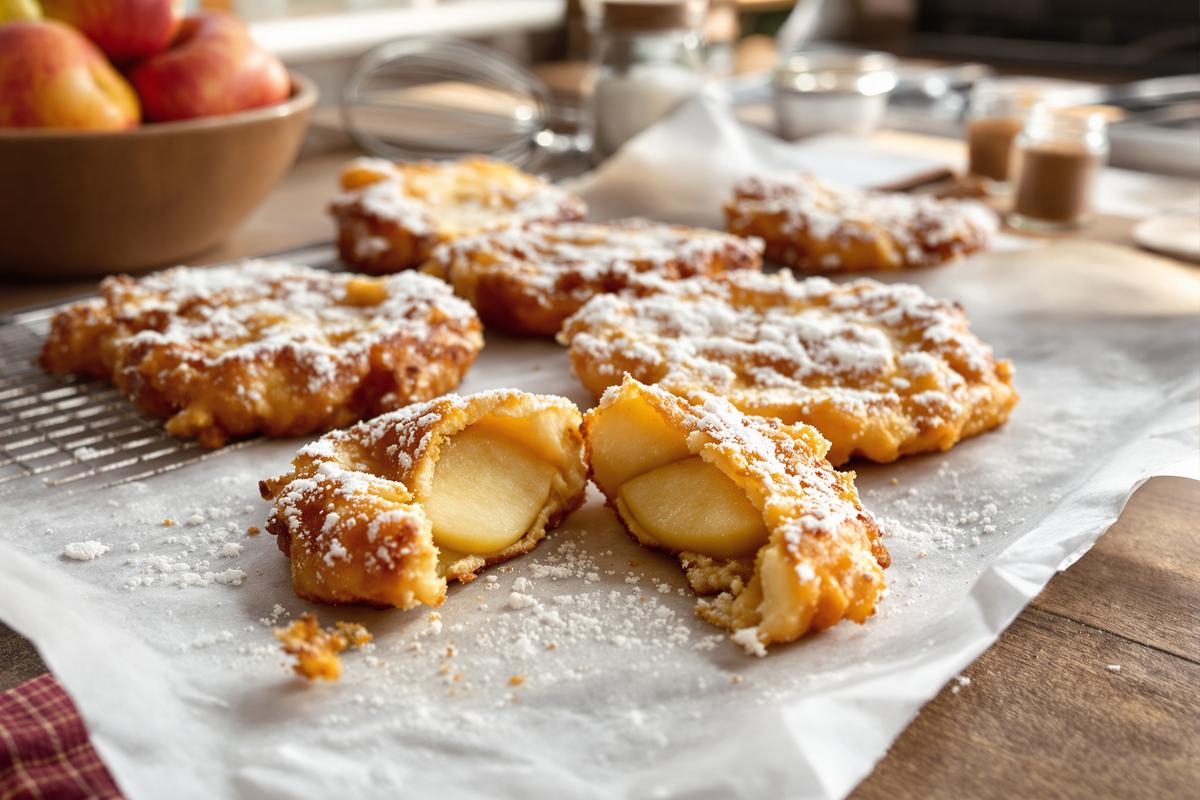 Une fois plongées dans l’huile chaude, ces rondelles de pomme se transforment en petites merveilles dorées. Le contraste entre le croquant bien doré à l’extérieur et le fruit fondant à l’intérieur est tout simplement irrésistible.